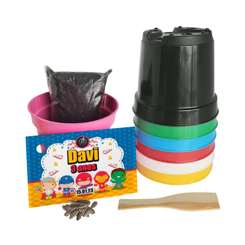 Kit para plantar com: Vaso plástico mini, substrato de terra, pazinha madeira e sementes de flores e temperos;