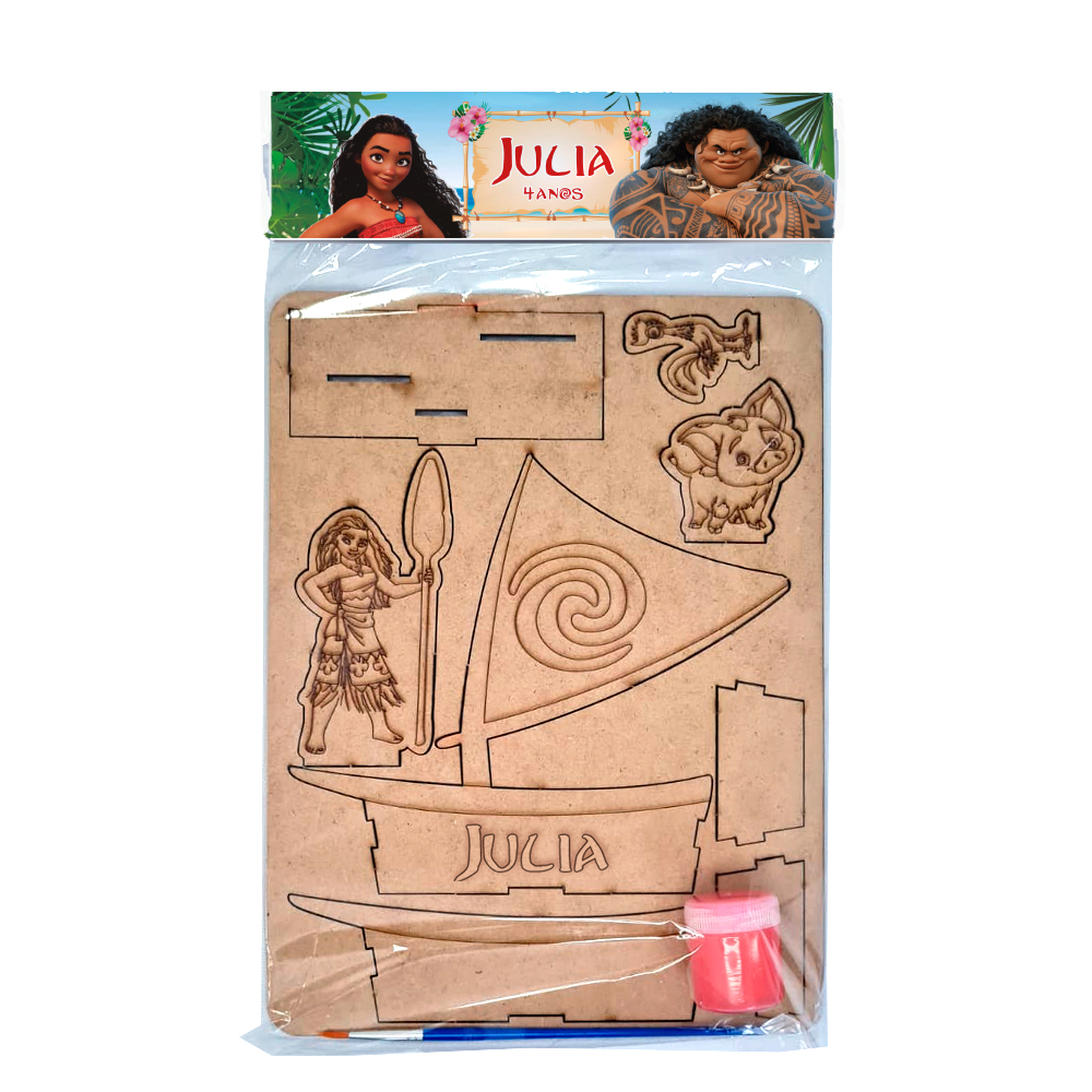 Kit para pintar com: barquinho em mdf com gravação, 3 personagens do filme Moana, 1 pote de tinta guache, pincel, embalagem celofane e solapa personalizada;