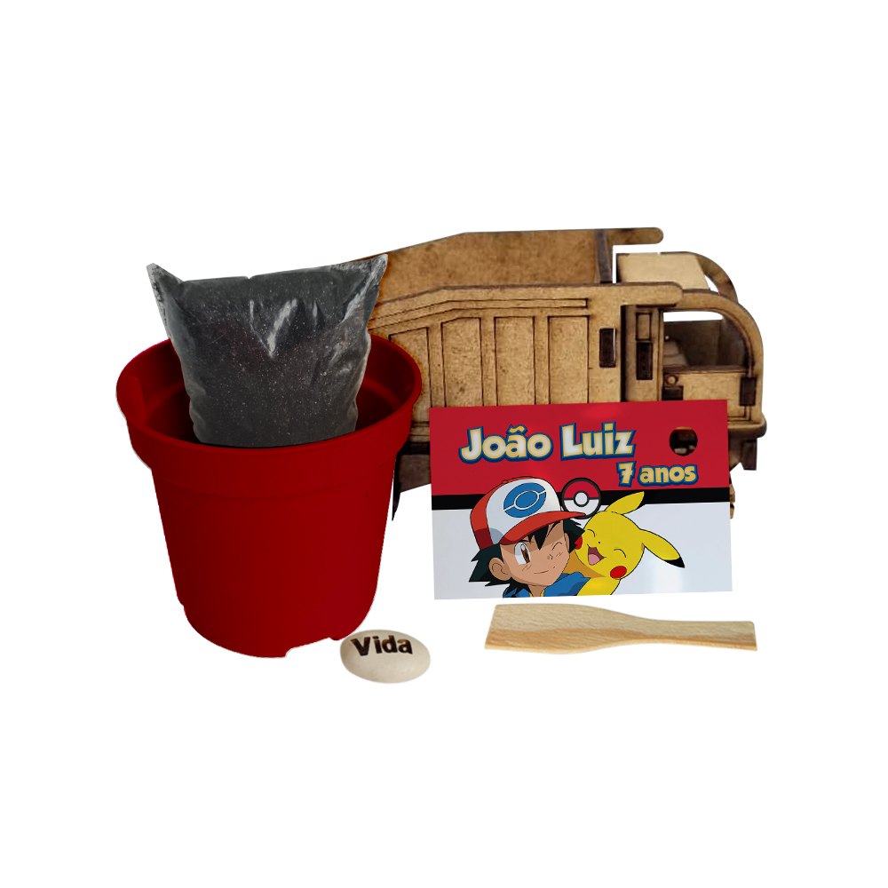 Kit para plantar com: caminhão mdf, vaso plástico colorido, substrato de terra, pazinha madeira e semente personalizada com gravação;