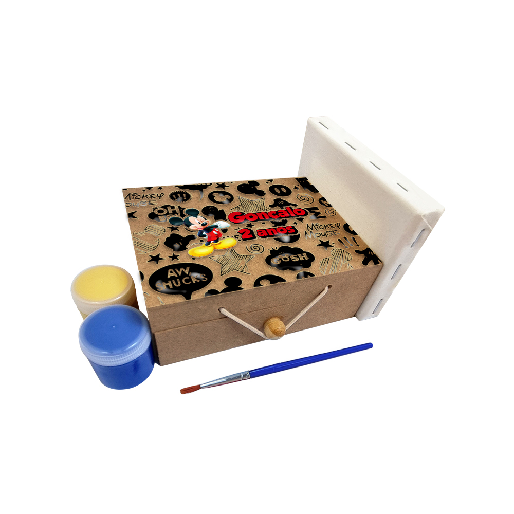 Kit para pintar com: Caixa mdf personalizada com dtf uv colorida com fechamento de elástico, Tela pintura de algodão, 2 potes de tinta, 1 pincel, embalagem celofane e adesivo personalizado;