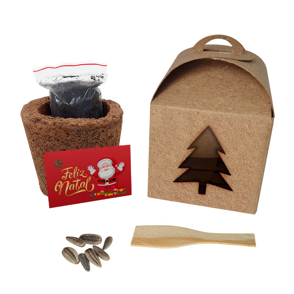 AL123 - Lembrancinha Plante e Cultive Kraft Personalizado com Vaso Eco e Sementes Flores - Tema Natalino